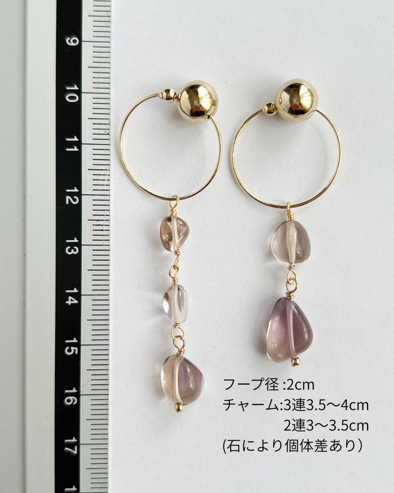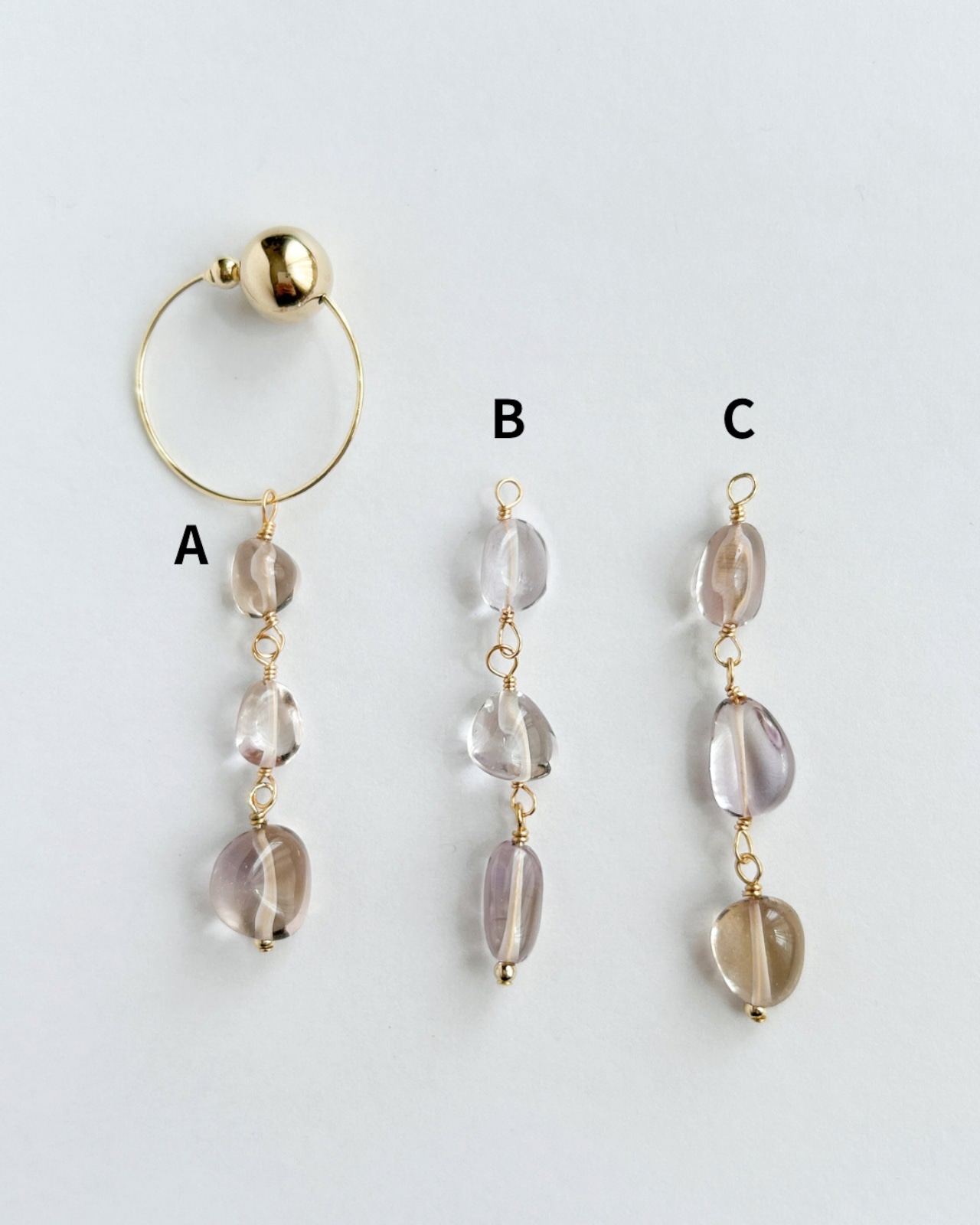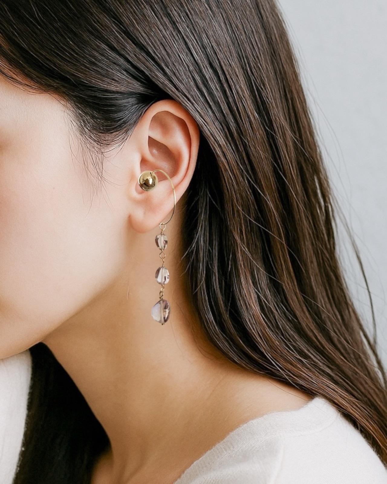 アクセサリーは大変繊細です。特に耳を挟む球体パーツは無理に引っ張ったり捻ったりせず、優しくお取り扱いください