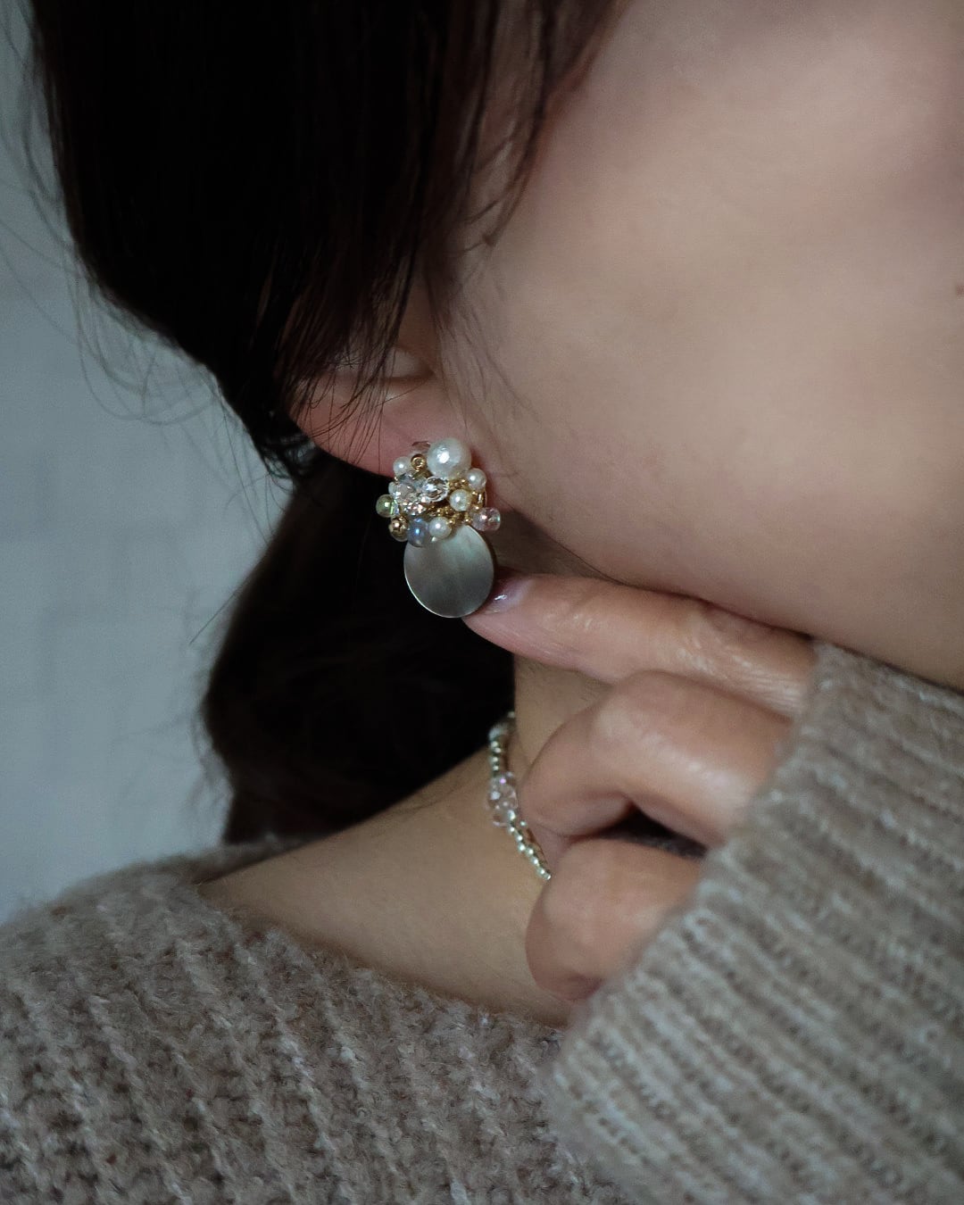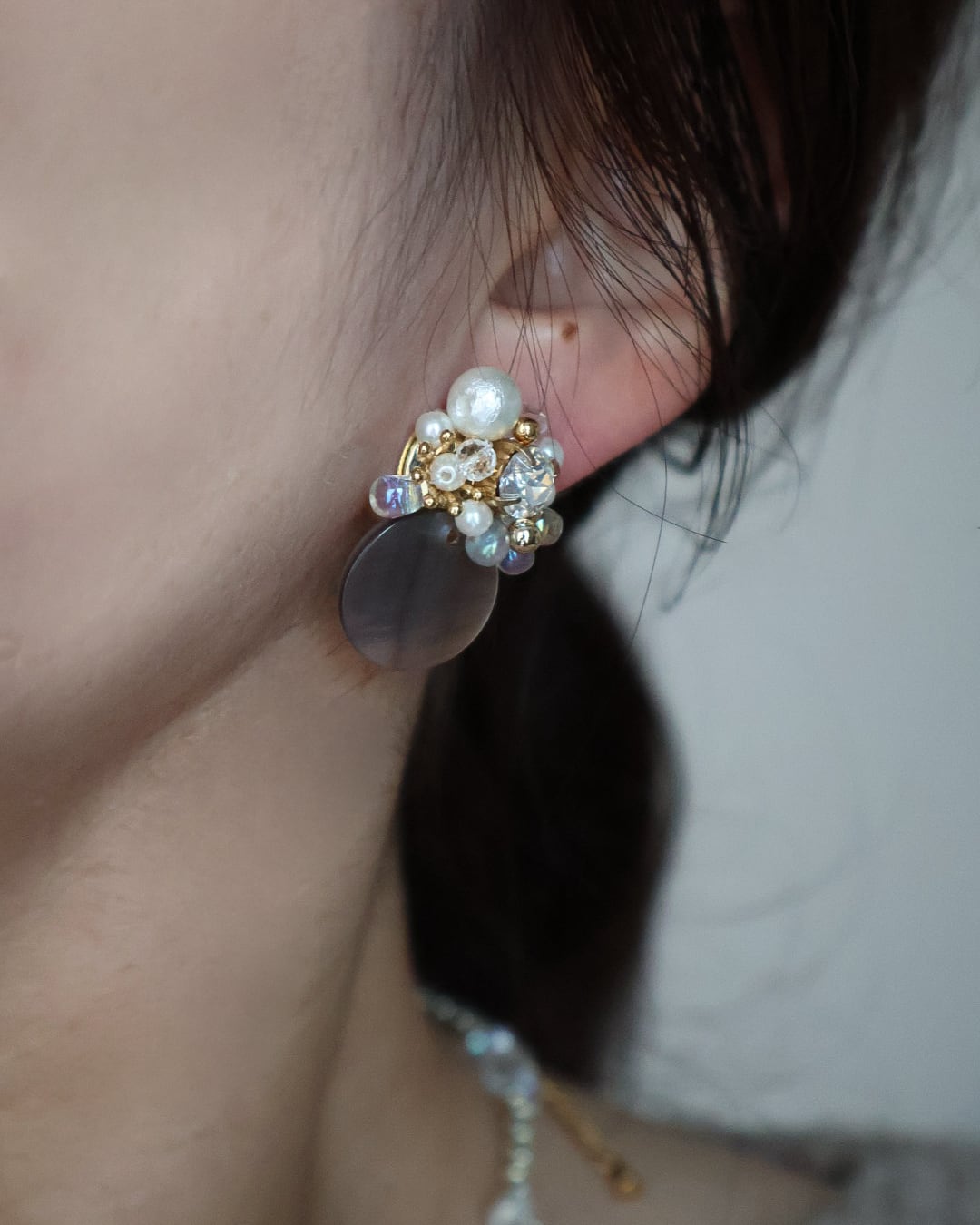 この技法を用いることで、クリスタルガラスやコットンパール、小さなビーズたちの輪郭がきりっと際立ち、立体的な仕上がりに。